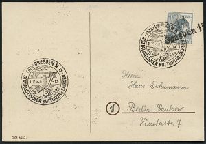 | 3705 | 50 € | SOWJETISCHE BESATZUNGSZONE (1945-49) : (10a) DRESDEN N 15/ SOZIALISTISCHER KULTURTAG SACHSEN 1948 (1.7.) SSt = Hand mit Hammer u. Fackel auf EF 12 Pf. Arbeiter mit Bezirks-Handstpl. "14/ Dresden 15" (Mi.170 EF + 40.- EUR = Währungsreform) sehr seltene, motivgleiche Sonder-Kt. (Michaelis Nr.23 + 120.- DM, 1991) klar gest. Inl.-Karte (Bo.123) | | |