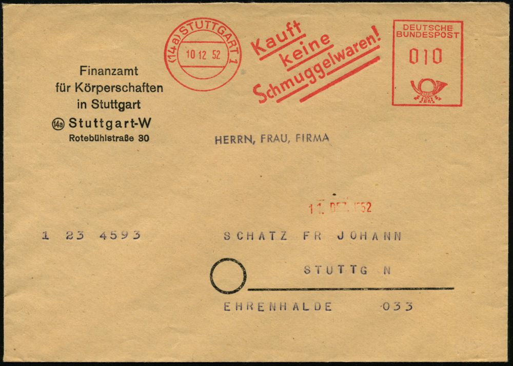 | 3911 | 18 € | KALTER KRIEG (OST-WEST-KONFLIKT) 1945-90 : (14a) STUTTGART 1/ kauft/ keine/ Schmuggelwaren! 1952 (10.12.) seltener AFS Francotyp klar auf Dienst-Bf.: Finanzamt Körperschaften, vergl. Los Nr. 3895 (Dü.E-23CG) | | |