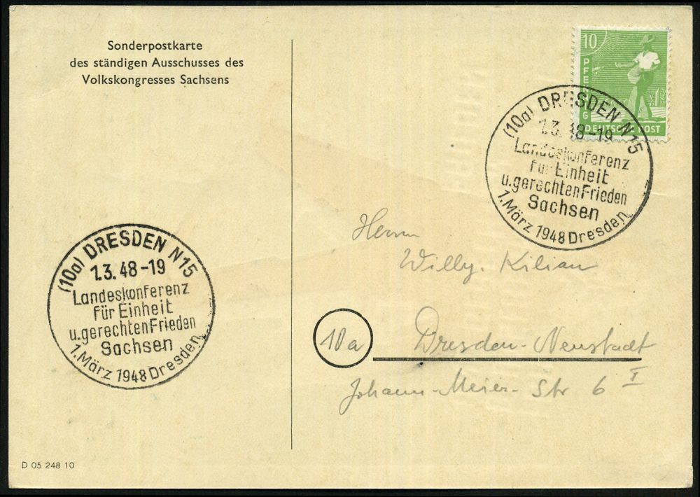 | 3891 | 20 € | KALTER KRIEG (OST-WEST-KONFLIKT) 1945-90 : (10a) DRESDEN N 15/ Landeskonferenz/ für Einheit/ u.gerechten Frieden.. 1948 (1.3.) SSt auf zweifarbiger Künstler-Sonderkarte: FÜR DEUTSCHLAND EINHEIT.. (Michaelis Nr.19, + 40.- DM, 1991) seltene Orts-Kt. (Bo.119) | | |