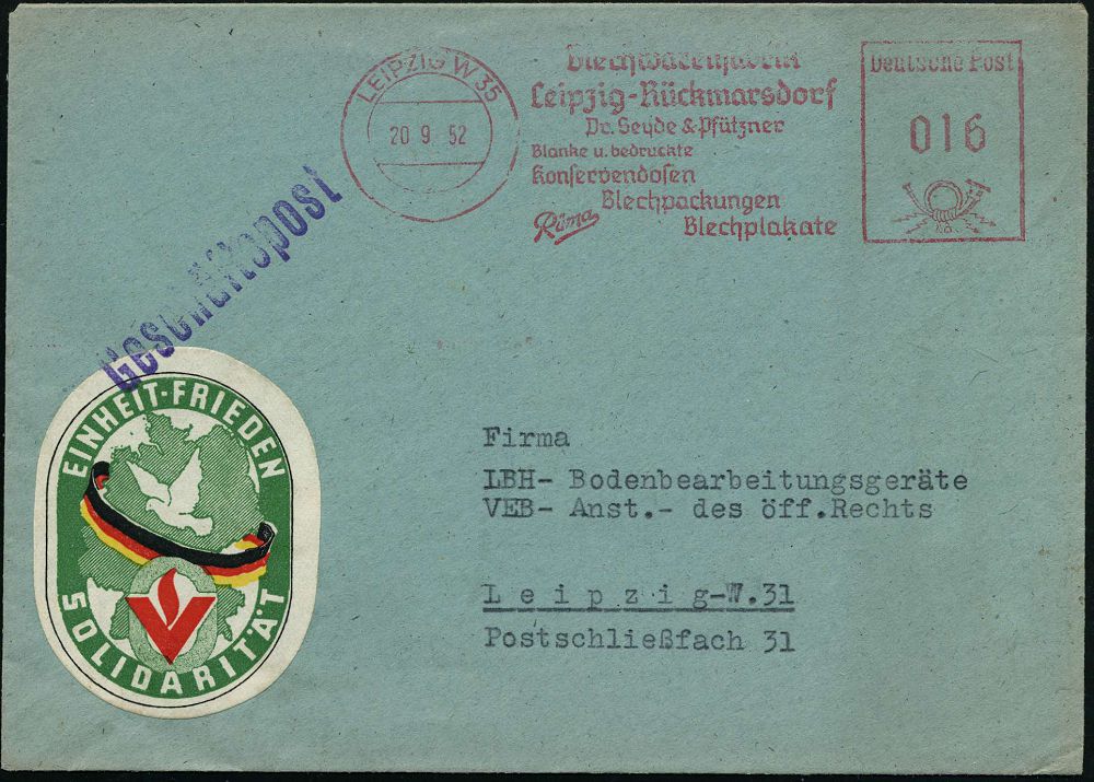| 3901 | 18 € | KALTER KRIEG (OST-WEST-KONFLIKT) 1945-90 : LEIPZIG W 35/ Blechwarenfabrik/ ..Dr.Seyde & Pfützner.. 1952 (20.9.) AFS Francotyp + ovale, amtl. VS-Propaganda-Vignette: EINHEIT - FRIEDEN/SOLIDARITÄT = Taube vor gesamtdeutscher Landkarte, V S = Volks-Solidarität, Firmen-Orts-Bf. (Dü.E-20CG) | | |