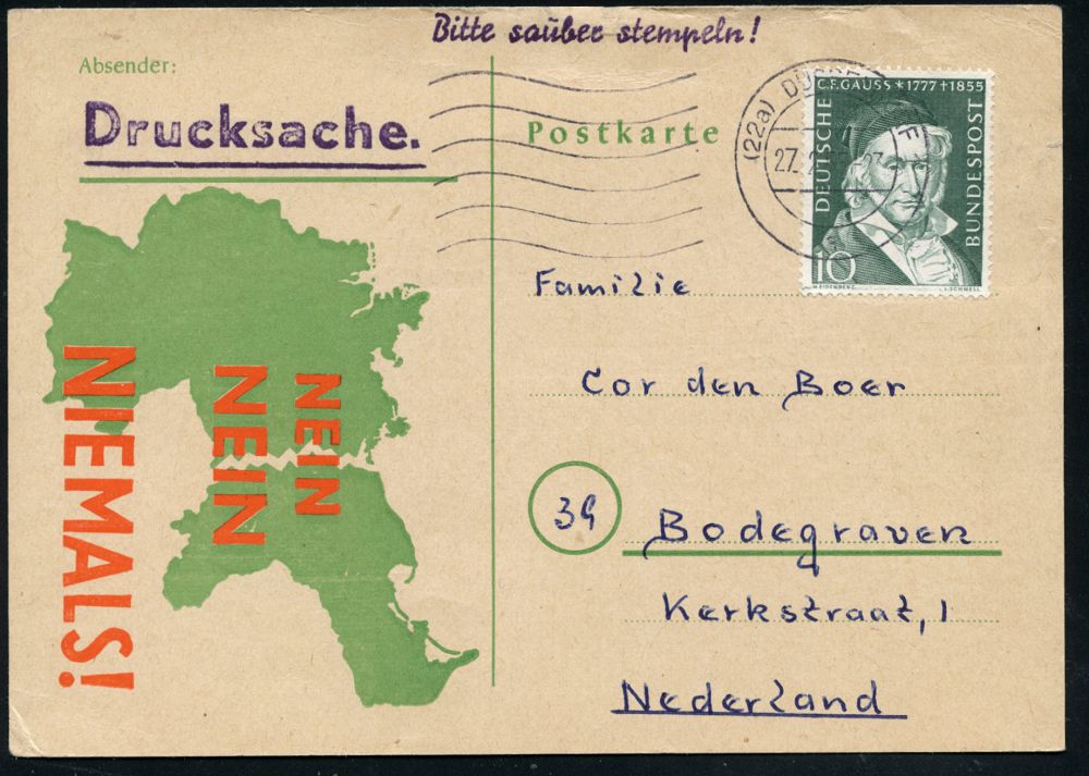 | 3892 | 18 € | KALTER KRIEG (OST-WEST-KONFLIKT) 1945-90 : (22a) DÜSSELDORF 1/ a 1955 (27.2.) MaWellenSt auf zweifarbiger Propaganda-Kt.: NEIN NEIN NIEMALS! = Deutschland in den Grenzen von 1937 ! , Bedarfs-Ausl.-Karte (Mi.204 EF) | | |