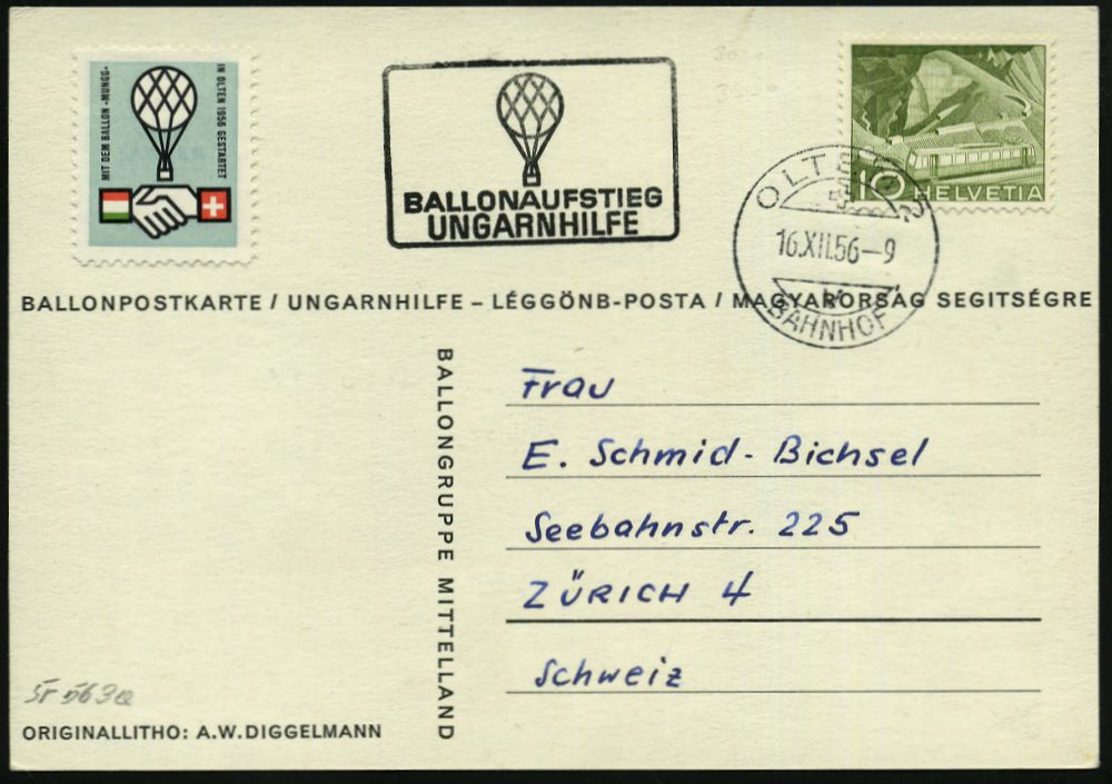 | 3919 | 25 € | KALTER KRIEG (OST-WEST-KONFLIKT) 1945-90 : SCHWEIZ 1956 (16.12.) Ballon-Sonderkarte: "Ungarnhilfe" , 1K: OLTEN 2/BAHNHOF + Ballon-HdN: UNGARNHILFE + Color-Ungarn-Hilfe-Spenden-Vign. = Aufstand der Ungarn gegen sowjet. Besatzung, Inl.-Karte (SF.563 a) | | |