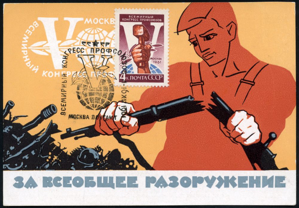 | 3921 | 15 € | KALTER KRIEG (OST-WEST-KONFLIKT) 1945-90 : UdSSR 1961 3 Kop. BiP Rakete, grün: 5. Weltgewerkschafts-Kongreß Moskau, Motiv zur Abrüstung = Arbeiter zerbricht Gewehr, Waffen-Schrott (das Gegenteil fand statt !), ungebr., vergl. Los Nr. 3922 | | |