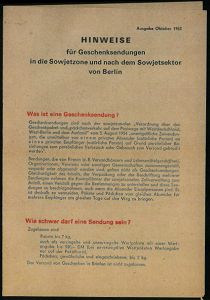 | 3913 | 16 € | KALTER KRIEG (OST-WEST-KONFLIKT) 1945-90 : B.R.D. 1963 (Okt.) Faltblatt: HINWEISE für Geschenksendungen in die Sowjetzone.. (Format A5, 4 Seiten) des Büros für gesamtdeutsche Hilfe, Bonn nach dem Mauerbau | | |