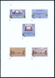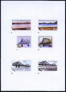 | 3914 | 15 € | KALTER KRIEG (OST-WEST-KONFLIKT) 1945-90 : B.R.D. 1997 (Nov.) 110 Pf. "Glienicker Brücke", 23 verschiedene Color-Alternativ-Entwürfe der Bundesministeriums für Finanzen auf 4 Entwurfsblättern der Bundesdruckerei (Format A5) = Grenzbrücke zur DDR, berühmt durch Agentenaustausch im Kalten Krieg, z.B. Atomspion Abel, Pilot-Spion Powers u.a., Aufl. nur 1000, vergl. Los Nr. 3915 (zu Mi.1967) | | |