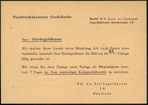 | 3883 | 15 € | KALTER KRIEG (OST-WEST-KONFLIKT) 1945-90 : BERLIN W 8/ Handwerkskammer/ Groß-Berlin/ ..Nur im Frieden/ kann das Handwerk gedeihen 1964 (17.7.) AFS Francotyp auf Dienst-Kt.: Sterbegeldkasse mit altem, gesamtdeutschen Handwerks-Logo !, "Groß-Berlin" nach ddem Mauerbau obsolet! (die "Sterbekasse" galt nicht für West-Berlin) | | |