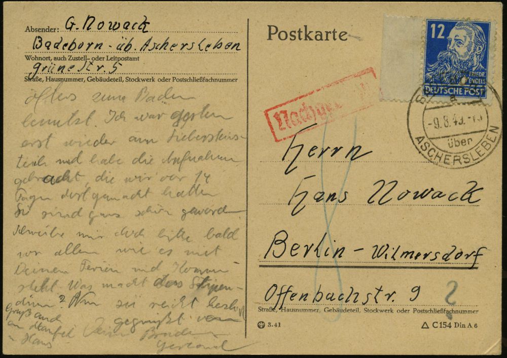 | 3923 | 18 € | POSTKRIEG : BADEBORN/ a/ über/ ASCHERSLEBEN 1949 (9.8.) 2K-Steg = PSt.I auf EF 12 Pf. Engels, Randstück + roter Ra.: Nachgebühr (8 Pf.) = Berlin -Wilmersdorf, Postkriegs-Nachgebühr-Kt. (Mi.216 EF) | | |
