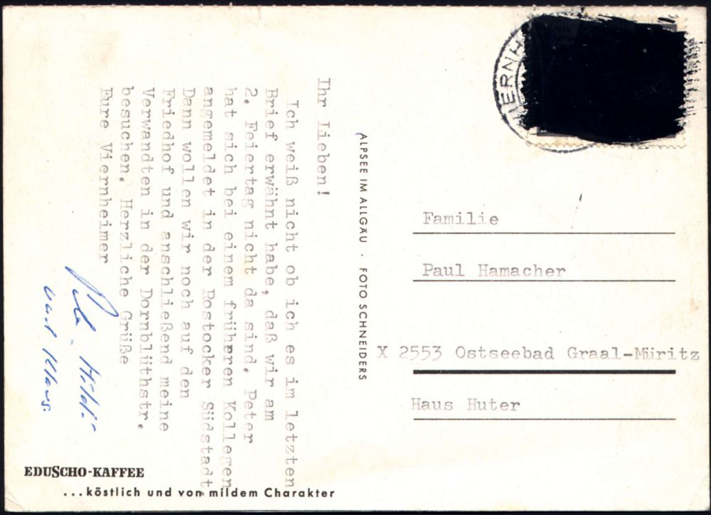 | 3934 | 18 € | POSTKRIEG : Viernheim 1965 1K-Segment auf EF 20 Pf. "20 Jahre Vertreibung" Übermalung schwarzer Lack! (= Burhop Nr. 60 a) Bedarfskt. n. Graal-Müritz (Mi.479 EF) | | |