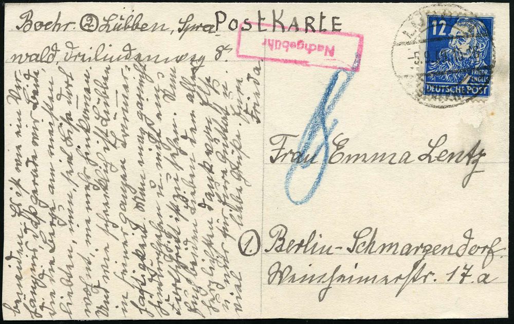 | 3931 | 18 € | POSTKRIEG : LÜBBEN/ (SPREEWALD)/ b 1949 (5.9.) 12 Pf. Friedr. Engels, EF nicht anerkannt + roter Ra.: Nachgebühr "8" Pf. (Burhop Nr.13 I a) Nachgebühr-Kt. n. West-Berlin = Berliner Postkrieg! (Mi.216 EF) | | |