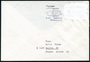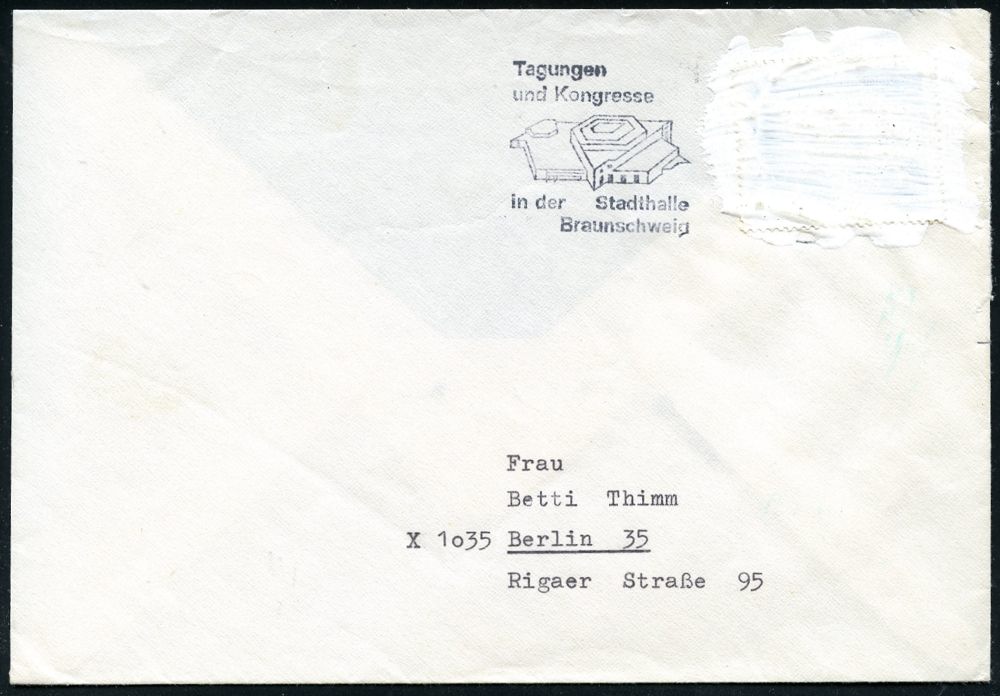 | 3928 | 25 € | POSTKRIEG : 33 BRAUNSCHWEIG 1/ ..Stadthalle 1965 MWSt auf EF 20 Pf. "20 Jahre Vertreibung" in der DDR mit weißer Farbe unkenntlich gemacht!! (Mi. 479/EF) n. Ost-Berlin! (Burhop Nr. 60 c) seltener Postkriegs-Beleg! (Bo.65 A , nur 1965 verwendet) | | |
