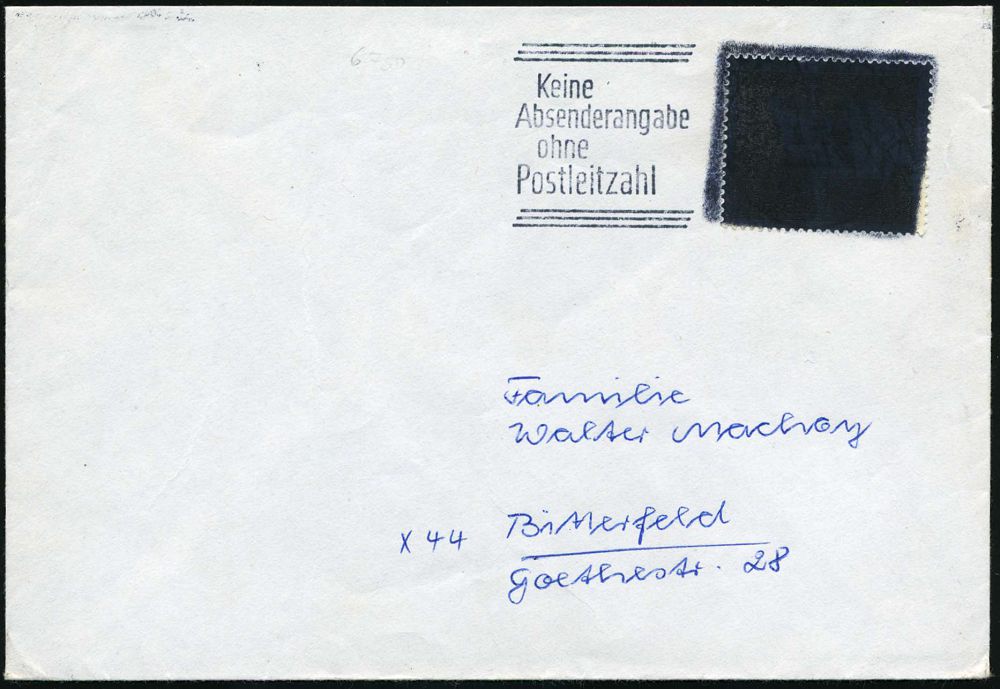 | 3929 | 18 € | POSTKRIEG : 2 HAMBURG/ Keine/ Absenderangabe/ ohne/ Postleitzahl 1965 20 Pf. "20 Jahre Vertreibung" EF, g e s c h w ä r z t (mattschwarz = Burh.60 b) Fern-Bf. n. X - 44 Bitterfeld (Mi.479 EF) | | |