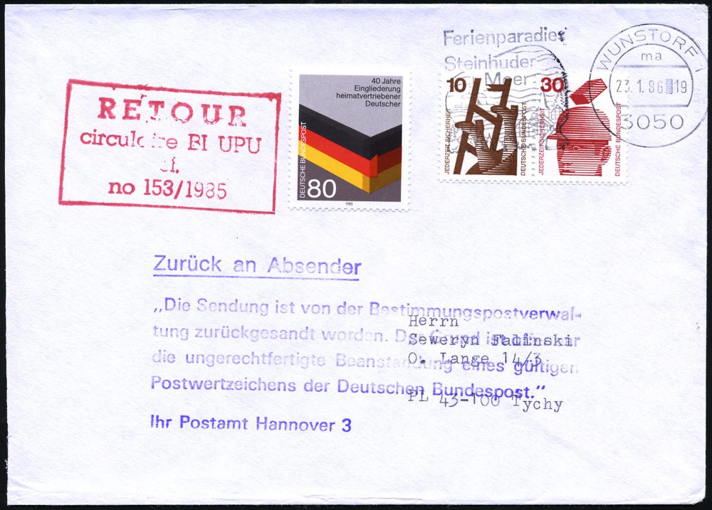 | 3936 | 15 € | POSTKRIEG : Wunstorf 1986 (23.1.) 80 Pf. "40 Jahre Vertreibung", EF + roter Ra.: RETOUR/circulaire BI UPU.. + viol. 6L: Postamt Hannover 3/.. ungerechtfertigte Beanstandung.., Ausl.-Retour-Bf. Polen (Mi.1265 u.a.) | | |