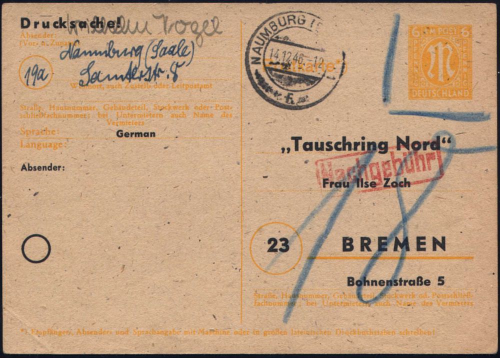 | 3933 | 25 € | POSTKRIEG : NAUMBURG (SAALE)1/ f 1946 (14.12.) 2K-Steg neben Wertstempel AM-Post P 6 Pf. gelb + Zudruck "Tauschring Nord" Bremen in Naumburg als Antwortkt. nicht anerkannt (Wertstempel blau umrahmt) roter Ra.: Nachgebühr ("18" Pf.) n.Bremen (Mi.P 905) | | |