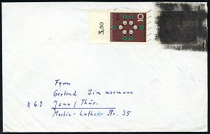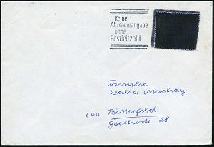 | 3926 | 18 € | POSTKRIEG : 1 BERLIN SW 11/ me/ VERGISS/ MEIN/ NICHT/ DIE/ POSTLEITZAHL 1967 MWSt auf 20 Pf. "20 Jahre Vertreibung", EF mit mattschwarzer Farbe unkenntl. gemacht (Burh.60b) Fern-Bf. nach X-69 Jena (Mi.479 EF) | | |