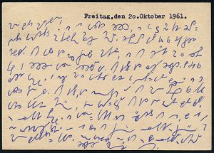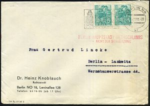 | 3924 | 20 € | POSTKRIEG : BERLIN N 4/ ad/ BERLIN-HAUPTSTADT DER DDR 1961 (Okt.) MWSt = Stalinallee + roter west-berliner 2L: BERLIN - HAUPT-STADT DEUTSCHLANDS/- NICHT DER SOWJETZONE n. Lankwitz, viel Inhalt (= Rechtsanwalt Ost!) teils in Steno! (Burhop 57 IV b) | | |