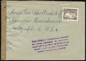 | 3937 | 35 € | POSTKRIEG : POLEN 1950 (3.6.) viol. Propaganda-HdN: Nous exigeons l´interdiction absolue/de l´arme atomique../criminel de guerre! = gegen atomare Aufrüstung u. Einsatz von Atomwaffen, EF 35 Zl. "Einheits-Kongreß der Bauernbewegung" (Mi.542 EF) + britische Eingangs-Zensur "4575" auf neutralen Streifen, Ausl.-Zensur-Bf. n. Hannover (Burhop Seite 77/ Heijs Seite 48, Typ. b) | | |