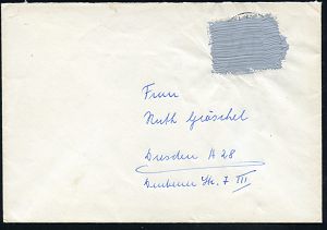| 3927 | 18 € | POSTKRIEG : 712 Bietigheim 1965 20 Pf. "20 Jahre Vertreibung" amtl. übermalt in grauer Farbe (Burhop 60 e) Fern-Bf. n. Dresden = Postkrieg im "Kalten Krieg"! (Mi.479 EF) | | |