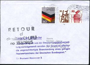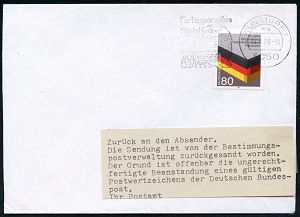 | 3935 | 15 € | POSTKRIEG : Wunstorf 1 1986 MWSt auf. EF 80 Pf. "40 Jahre Vertreibung" in die DDR (X-5632 Geismar) + amtl. Klebezettel "Zurück an den Absender.. ungerechtfertigte Beanstandung" (Hannover ?), codierter Retour-Bf. (Mi.1265 EF) | | |