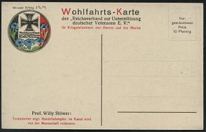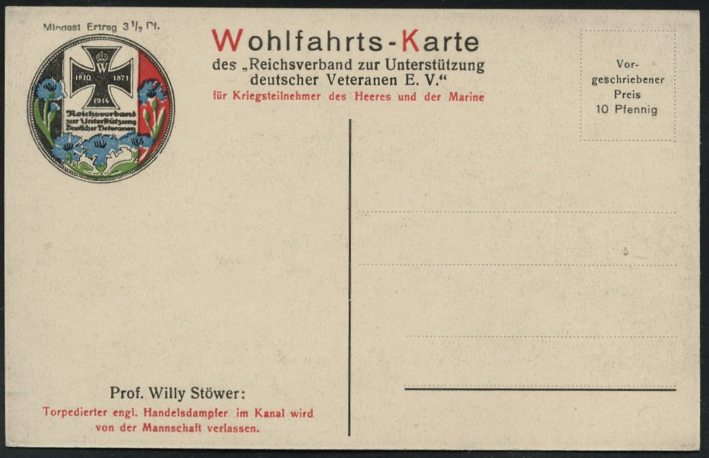 592 | 20 € | I. WELTKRIEG: MARINE-DIENST- & FELDPOST 1914-18 (OHNE MSP) : DEUTSCHES REICH 1916/17 2 verschiedene s/w.-Propagada-Künstler-Ak.: torpedierte englische Handelsschiffe des berühmten Marine-Malers Willy Stoewer = Veteranen-Spendenkt., je ungebr. (Einzelausruf möglich: je 12.- EUR) 2 Belege Uhv.: (Reichsverband zur Unterstützung Deutscher Veteranen) | ![]() ![]() ![]() | |