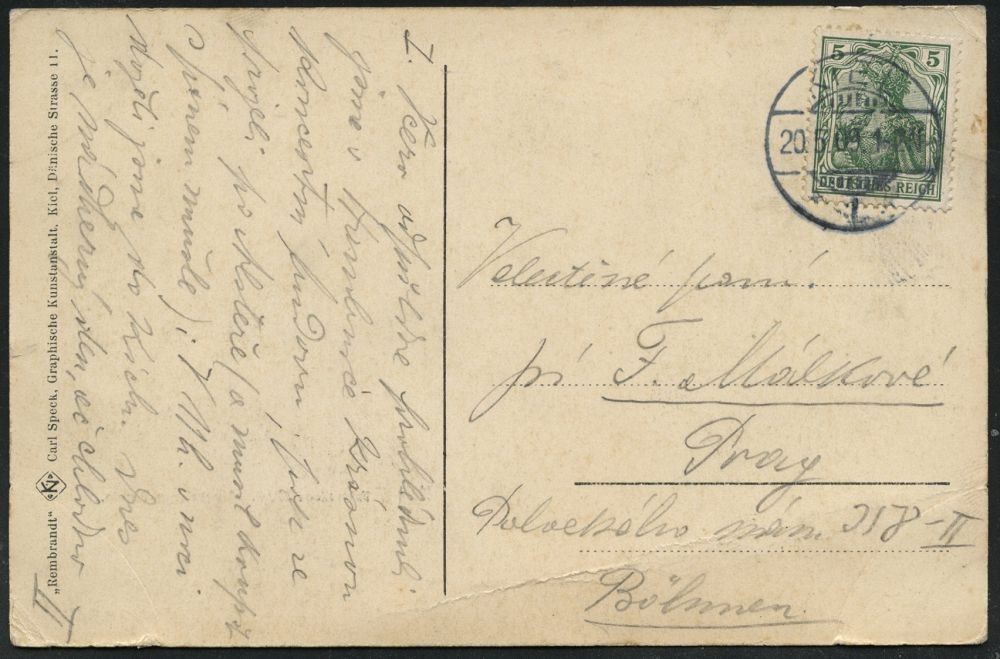 586 | 12 € | I. WELTKRIEG: MARINE-DIENST- & FELDPOST 1914-18 (OHNE MSP) : KIEL/ *1* 1909 (20.5.) 1K-Gitter auf EF 5 Pf. Germania, monochrome Foto-Ak.: Kaiserl. Werft Ausrüstungs-Bassin (kl. Beförd.-Mäng.,) Bedarf n. Prag = Inl.-Tarif ! (Mi.85 I) | ![]() ![]() | |