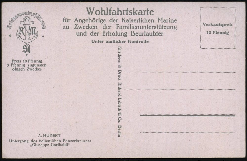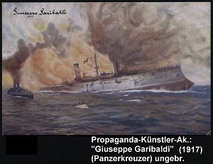 597 | 14 € | I. WELTKRIEG: MARINE-DIENST- & FELDPOST 1914-18 (OHNE MSP) : ITALIEN / DEUTSCHES REICH 1917 (ca.) Color-Künstler-Spenden-Ak.: Untergang italien. Panzerkreuzer "G. Garibaldi" des Marinemalers A. Hubert (Reichsmarinestiftung) ungebr. | ![]() ![]() | |