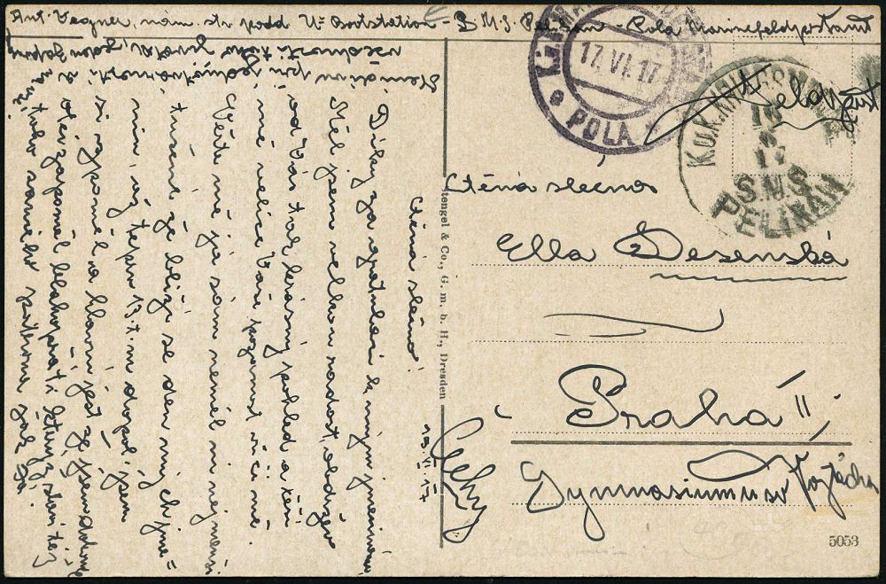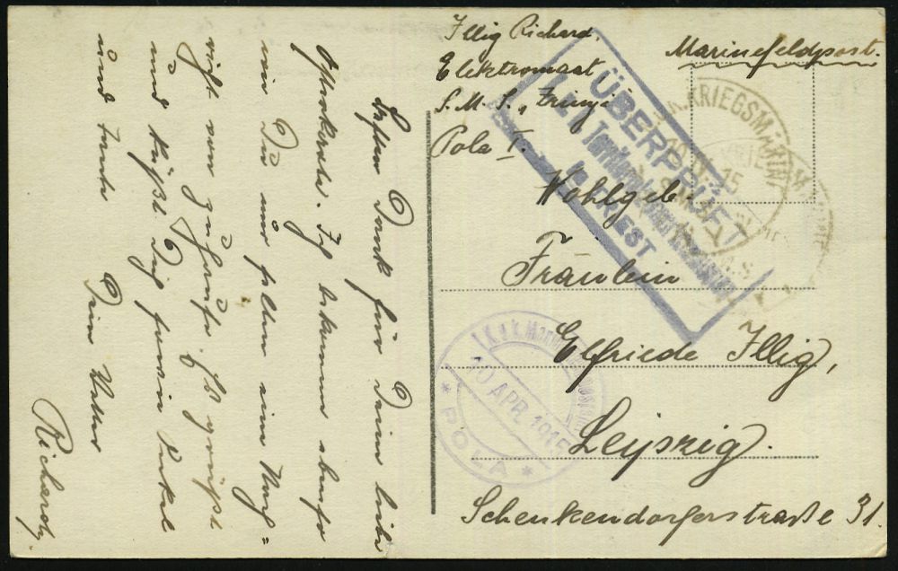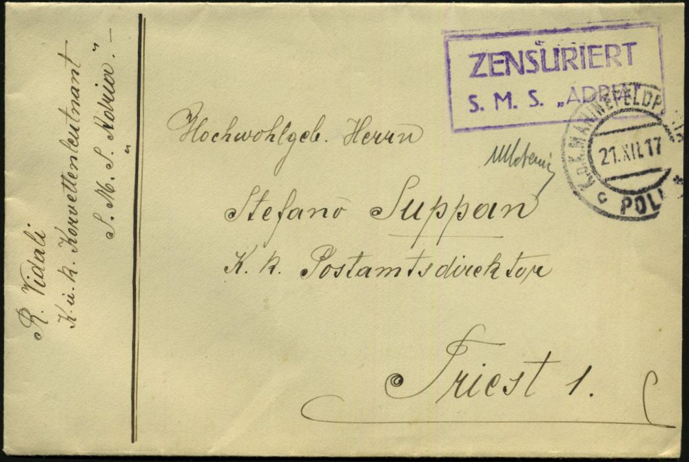 605 | 18 € | I. WELTKRIEG: MARINE-DIENST- & FELDPOST 1914-18 (OHNE MSP) : ÖSTERREICH 1917 (21.12.) 2K-Steg: K.u.K. MARINEFELDPOST/c POLA * + viol. Ra.2: ZENSURIERT/S.M.S. "ADRIA" = Artillerie-Schulschiff + vs. hs. Abs.: "K. u. k. Korvettenleutnant S.M.S. Adria" = Artillerie-Schulschiff, klar gest. Feldpost-Zensur-Bf. n. Triest | ![]() | |