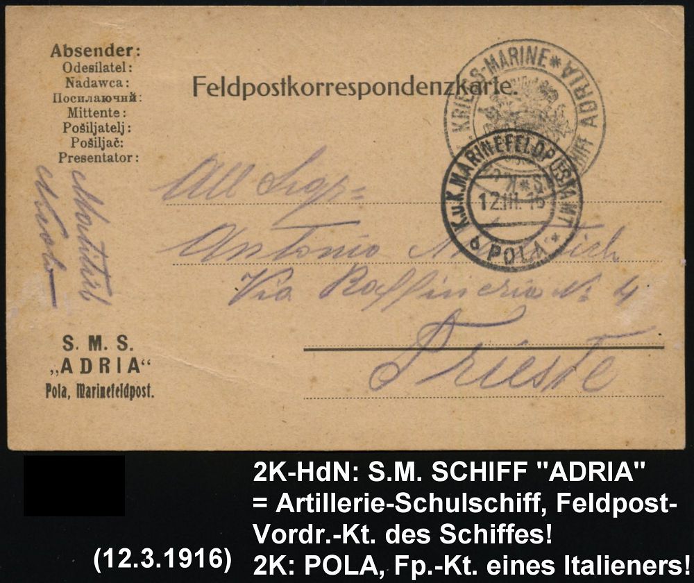 601 | 18 € | I. WELTKRIEG: MARINE-DIENST- & FELDPOST 1914-18 (OHNE MSP) : ÖSTERREICH 1915 (12.3.) 2K-BPA: K.u.K. KRIEGS-MARINE/S.M. SCHIFF ADRIA = Artillerie-Schulschiff + 2K: K.u.K. MARINEFELDPOSTAMT/d/POLA/*, klar gest. Feldpost-Vordr.-Kt.: S.M.S. "ADRIA", Pola n.Triest | ![]() | |