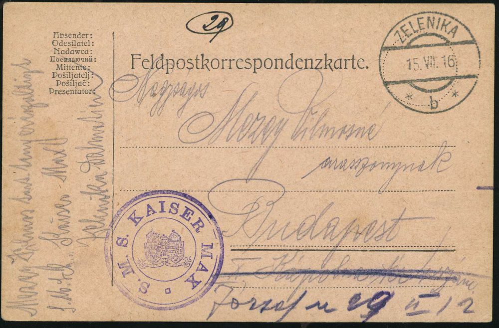 602 | 18 € | I. WELTKRIEG: MARINE-DIENST- & FELDPOST 1914-18 (OHNE MSP) : ÖSTERREICH 1916 (15.7.) viol. Bord-3K-HdN: S.M.S. KAISER KARL mit Wappe = Kasemattschiff (Panzerfregatte) + 1K-Brücke: ZELENIKA/*b*, klar gest. Feldpost-Kt. eines Ungarn n. Budapest | ![]() | |