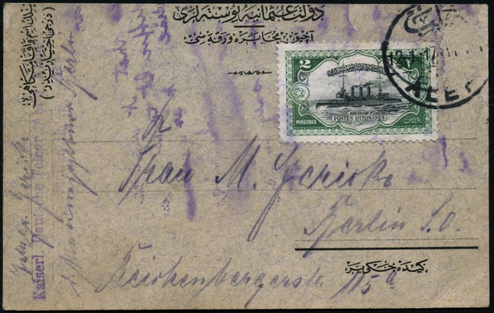 608 | 25 € | I. WELTKRIEG: MARINE-DIENST- & FELDPOST 1914-18 (OHNE MSP) : TÜRKEI 1917 (12.1.) 2 Pia. "Hamidiye", EF = Kreuzer der "Elswick"-Klasse (brit.) ex "Abdül Hamid" , 1K: ALEP (= ALEPPO) + viol. 2L: Kaiserl. deutsche Telegr. Abt. 2 Aleppo (etw. fleckige) Ausl.-Karte n. Berlin, seltene Frankatur! (Mi.238 EF) | ![]() | |