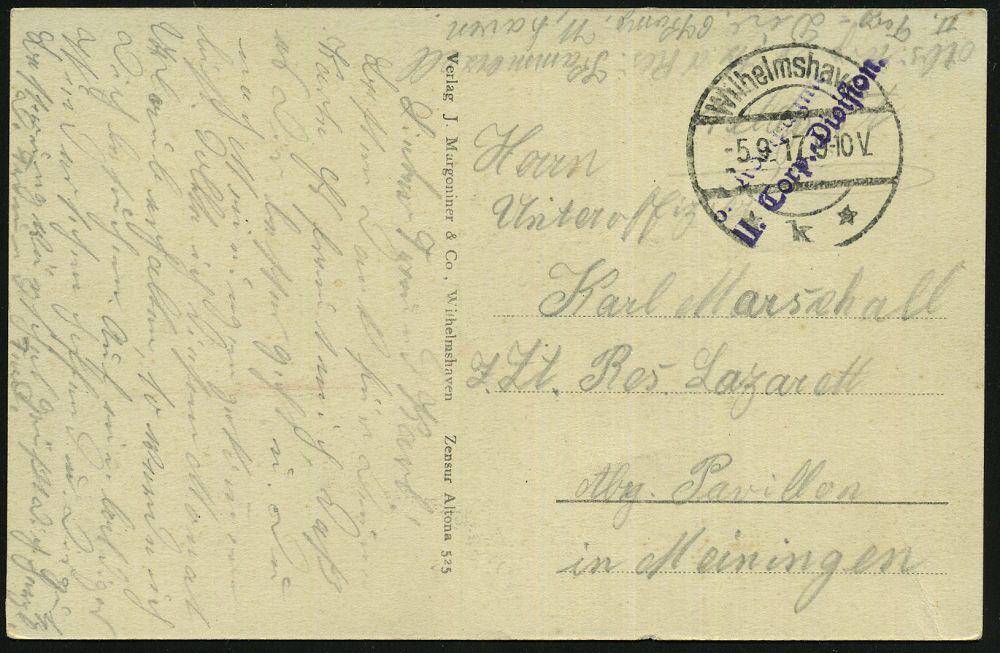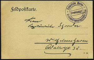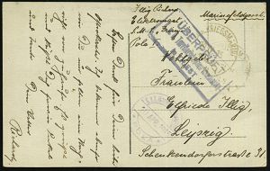 589 | 12 € | I. WELTKRIEG: MARINE-DIENST- & FELDPOST 1914-18 (OHNE MSP) : Wilhelmshaven/ *k* 1917 (5.9.) 1K-Brücke + viol. 2L: 6. Kompagnie/ II. Torp.(edo) Division + hs. Abs., passende s/w.-Feldpost-Ak.: manövrierende Torpedoboote an Res.-Lazarett Meiningen, schöne Kombination! | ![]() ![]() | |