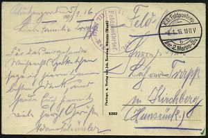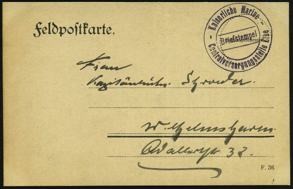 590 | 12 € | I. WELTKRIEG: MARINE-DIENST- & FELDPOST 1914-18 (OHNE MSP) : DEUTSCHES REICH 1915 viol. 2K: Kaiserliche Marine/Centralversorgungsstelle Elbe (Hamburg ?), klar gest. Feldpost-Kt. n. Wilhelmshaven | ![]() | |