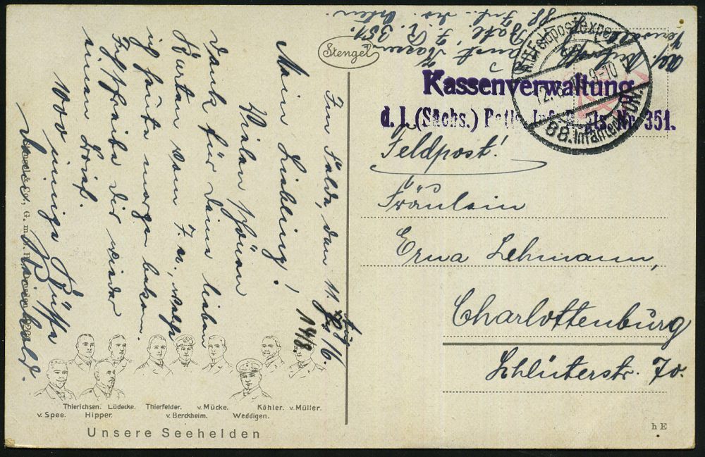 594 | 15 € | I. WELTKRIEG: MARINE-DIENST- & FELDPOST 1914-18 (OHNE MSP) : DEUTSCHES REICH 1916 (12.8.) Color-Propaganda-Künstler-Ak.: Unsere Seehelden.. von Spee, Hipper, v. Mücke u.v.a. vor U-Booten, Seeflieger, Kampfschiffen u. U-Boot , 1K-Brücke: K. D. Feldpostexp./der/88. Infanterie-Div. (Nr.767) etc., klar gest. Feldpost-Ak. n. Bln-Charlottenbg. | ![]() ![]() | |