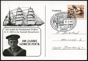 583 | 15 € | I. WELTKRIEG: MARINE-DIENST- & FELDPOST 1914-18 (OHNE MSP) : 2850 BREMERHAVEN 1/ ...100 Jahre "Gorch Fock" 1980 (16.8.) SSt (Großsegler-Takelage) Sonder-Kt.: 100 Jahre Gorch Fock = Pseudonym des Schiftstellers Johann Kinau (22.8.1880 - 31.5.1916) gefallen in der Skagerrak-Seeschlacht | ![]() | |
