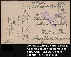 606 | 18 € | I. WELTKRIEG: MARINE-DIENST- & FELDPOST 1914-18 (OHNE MSP) : ÖSTERREICH 1918 (5.9.) viol. Ra.2: ZENSURIERT/S.M.S. Admiral Spaun = Rapidkreuzer (Kl. Kreuzer) benannt nach österr. General im 7jähr.Krieg + 2K-Steg: K.u.K. MARINEFELDPOSTAMT/d POLA * (nicht ganz voll), hs. Abs.: "S.M.S. Admiral Spaun" späte Feldpost.-Zensur-Ak. n.Wien | ![]() | |
