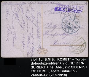 607 | 18 € | I. WELTKRIEG: MARINE-DIENST- & FELDPOST 1914-18 (OHNE MSP) : ÖSTERREICH 1918 (28.9.) 1K-Gitter: FIUME/y1y + 2K-Steg: SIBENIK + viol. 1L: S.M.S. "KOMET" = Torpedoboots-Zerstörer + viol. 1L: ZENSURIERT, späte Color-Feldpost-Ak. (Sibenik) n. Wien | ![]() ![]() | |