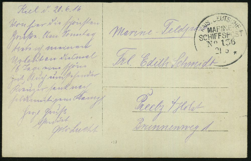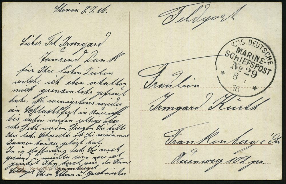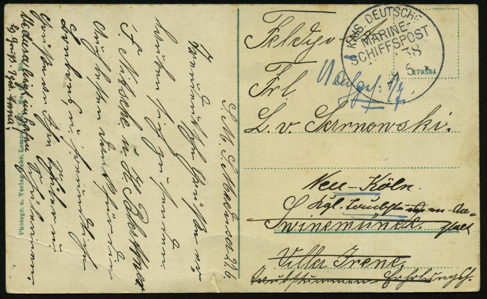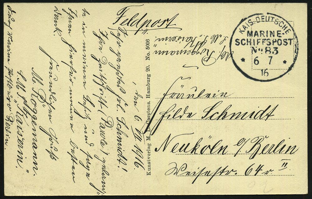 668 | 18 € | I.WELTKRIEG: DEUTSCHE MARINESCHIFFSPOST 1914 -18 : Marine-Schiffspost No. 83 1916 (6.7.) 1K-BPA: KAIS. DEUTSCHE/MARINE-/SCHIFFSPOST/No. 83/** = S.M.S. "Kaiserin", Linienschiff + 2x hs. Abs.: "..S.M.S. ´Kaiserin´", klar gest. monchrome-Feldpost-Ak.: S.M.S. Kaiserin ! n. Bln-Neukölln schöne Kombination! | ![]() ![]() | |