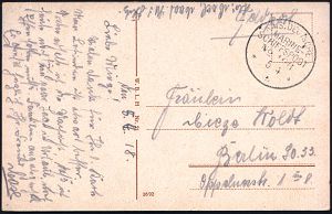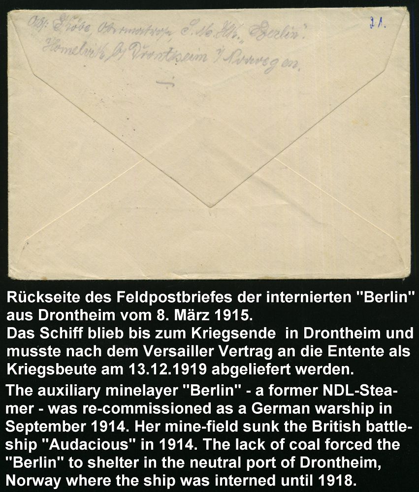 669 | 75 € | I.WELTKRIEG: DEUTSCHE MARINESCHIFFSPOST 1914 -18 : Marine-Schiffspost No. 88 1915 (8.3.) 1K-BPA.: KAIS. DEUTSCHE/MARINE-/SCHIFFSPOST/No.88 = S.M. Hilfskreuzer "Berlin" = Hilfs-Minenleger, Internierung in Drontheim, Norwegen! ,rs. entspr. hs. Abs.: "..S.M.S. ´Berlin´ Homelvik b. Drontheim i. Norwegen", klar gest. Feldpost-Bf. (kl. fast unsichtbarer Seitenriß) an Landesbischof Berlin-Brandenbg. in Berlin-Steglitz, selten! | ![]() ![]() | |