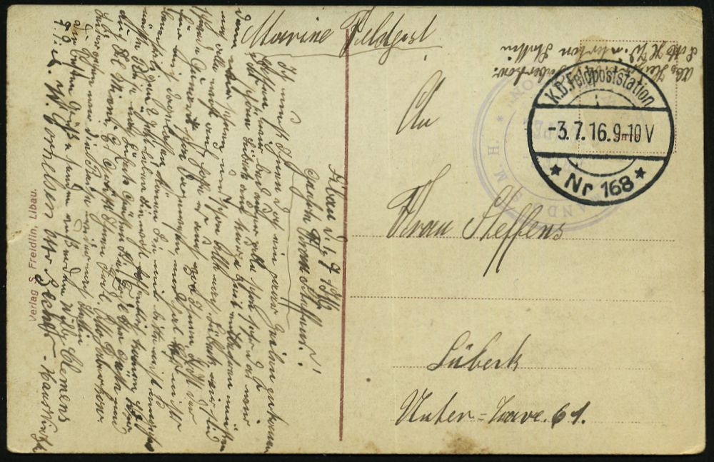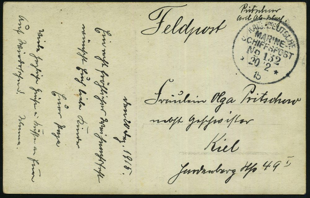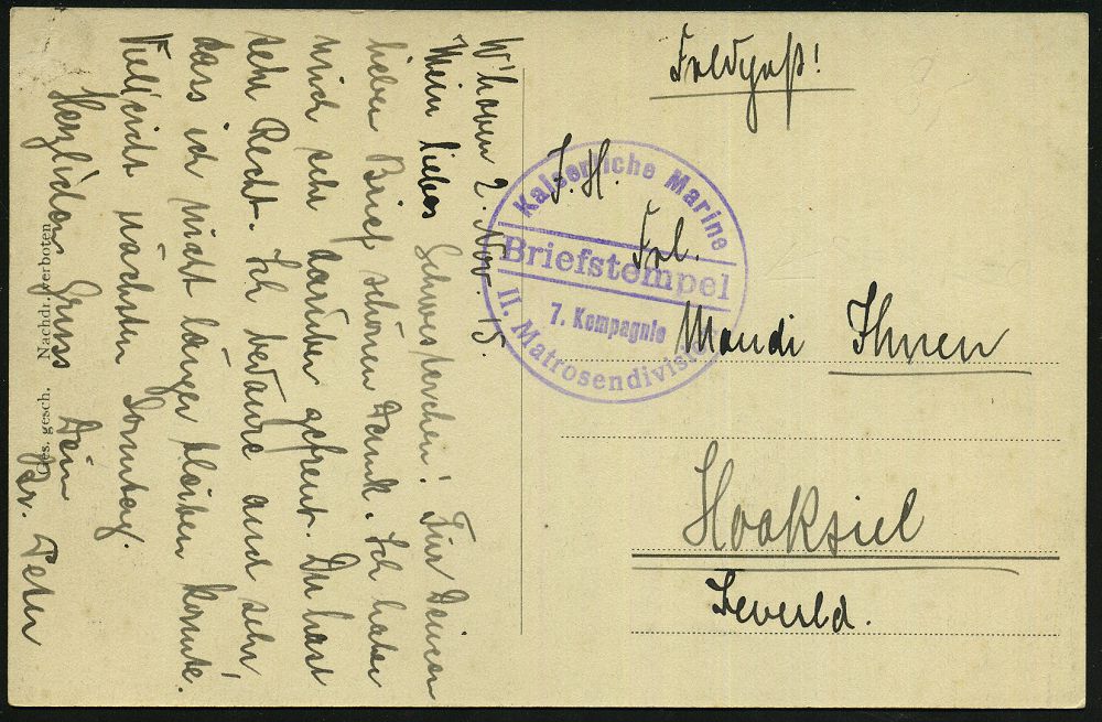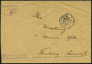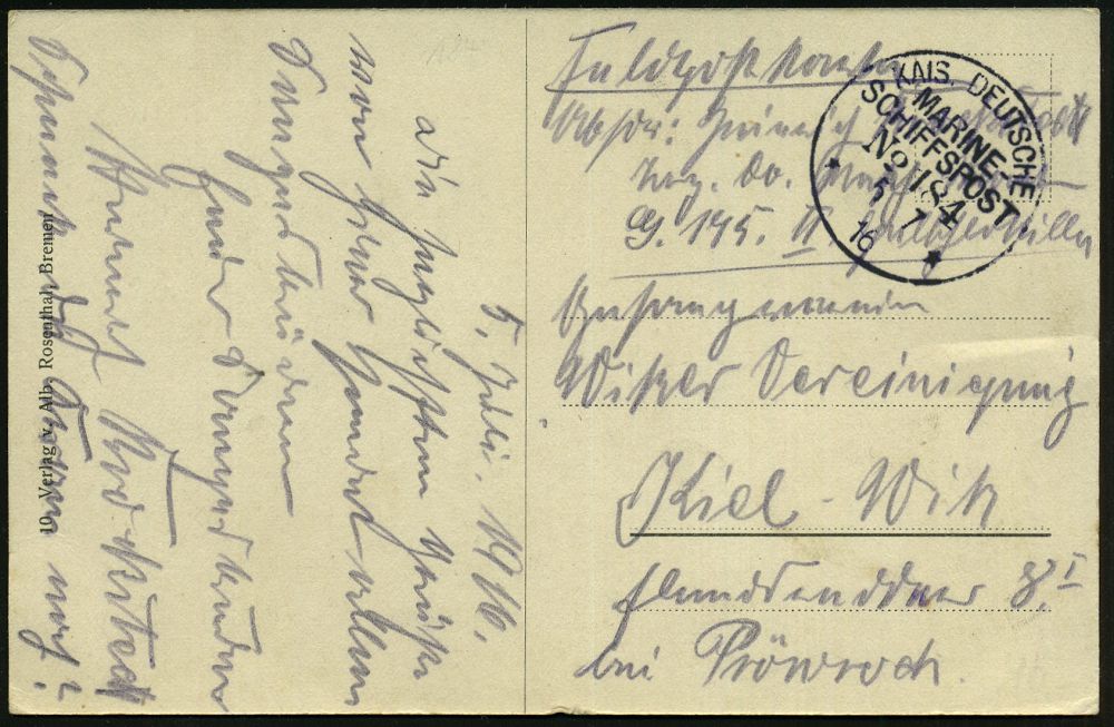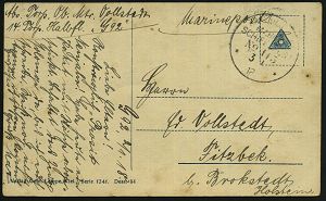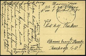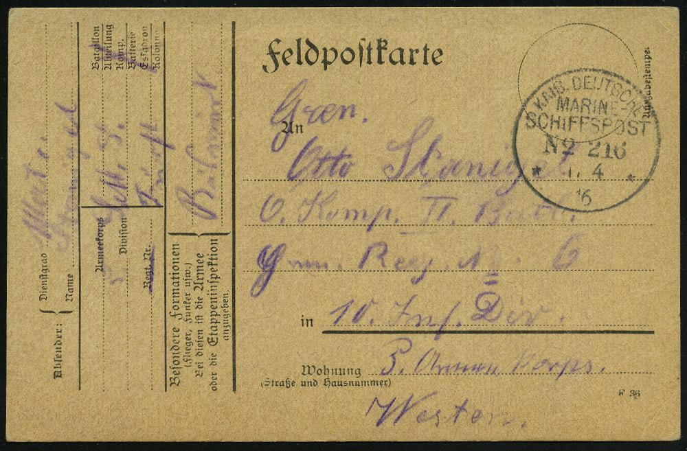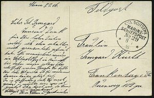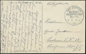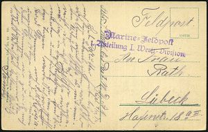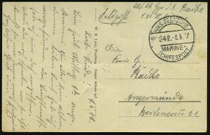 670 | 20 € | I.WELTKRIEG: DEUTSCHE MARINESCHIFFSPOST 1914 -18 : Marine-Schiffspost No. 89 1916 (18.4.) 1K-BPA: KAIS. DEUTSCHE/MARINE-/SCHIFFSPOST/No.89 = II. Minenräum-Division, Ostsee-Streitkräfte + hs. Abs.: ".. II. Minenräumdivision z. Zt. Libau" , klar gest. Feldpost-Ak.: Libau Hafen (= Liepaja, Lettland) n. Laboe, Ostsee-Einsatz Baltikum (MSP ab 4.11.1915) | ![]() ![]() | |