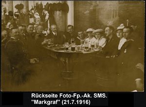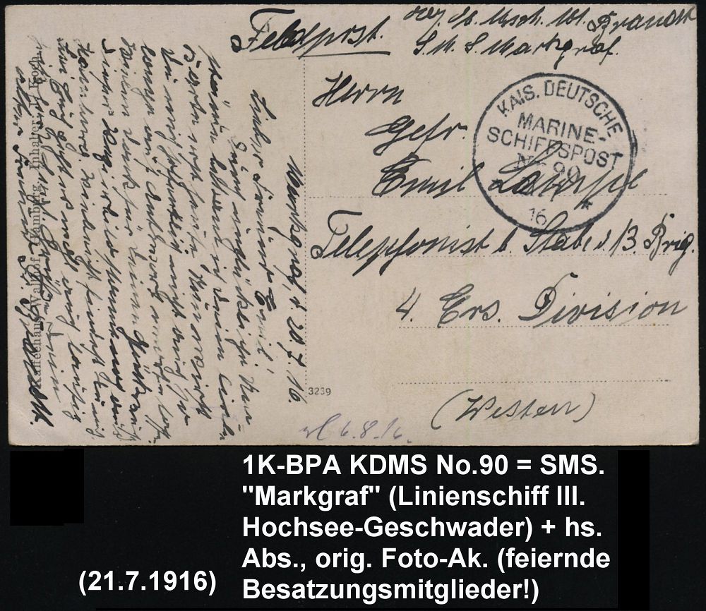 671 | 18 € | I.WELTKRIEG: DEUTSCHE MARINESCHIFFSPOST 1914 -18 : Marine-Schiffspost No. 90 1916 (21.7.) 1K-BPA: KAIS. DEUTSCHE/MARINE-/SCHIFFSPOST/No. 90 = S.M.S. "Markgraf", Linienschiff + hs. Abs.: "..S.M.S. Markgraf", klar gest. individuelle, monochrome Feldpost-Foto-Ak.: Angehörige der Besatzung mit Frauen und Bier an 4. Ers.-Division, Westfront | ![]() ![]() | |