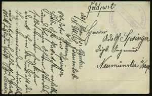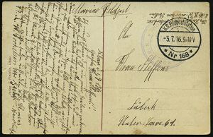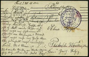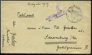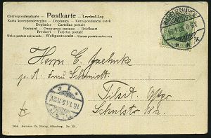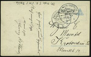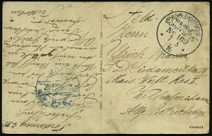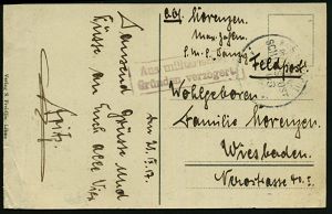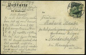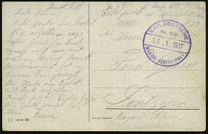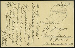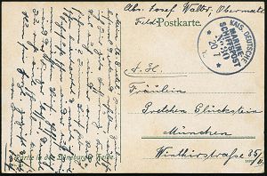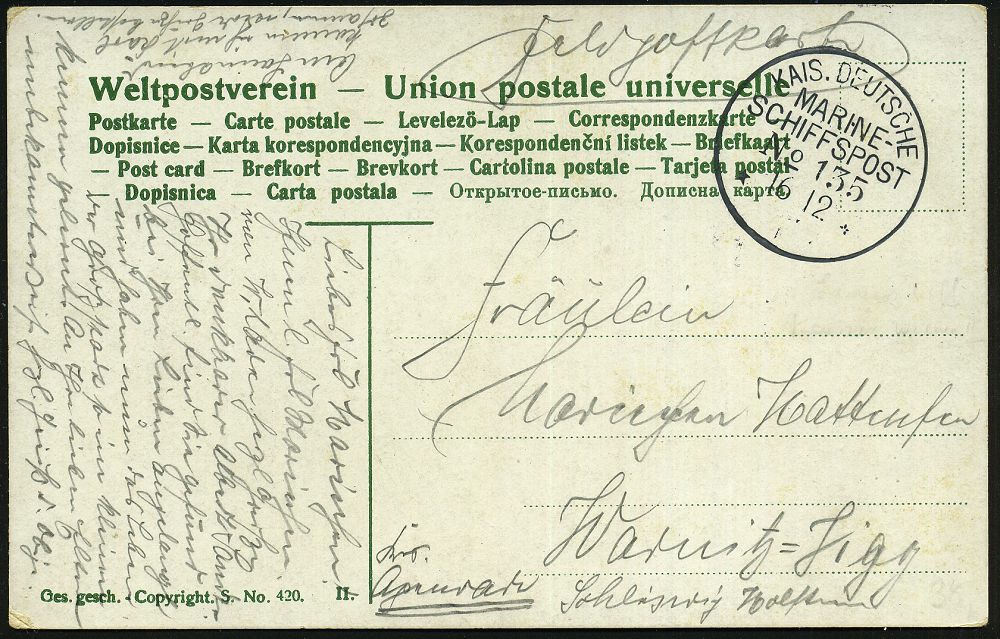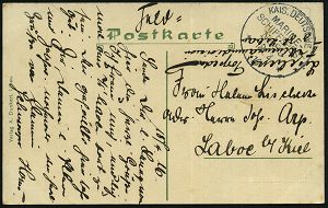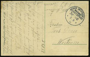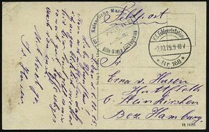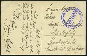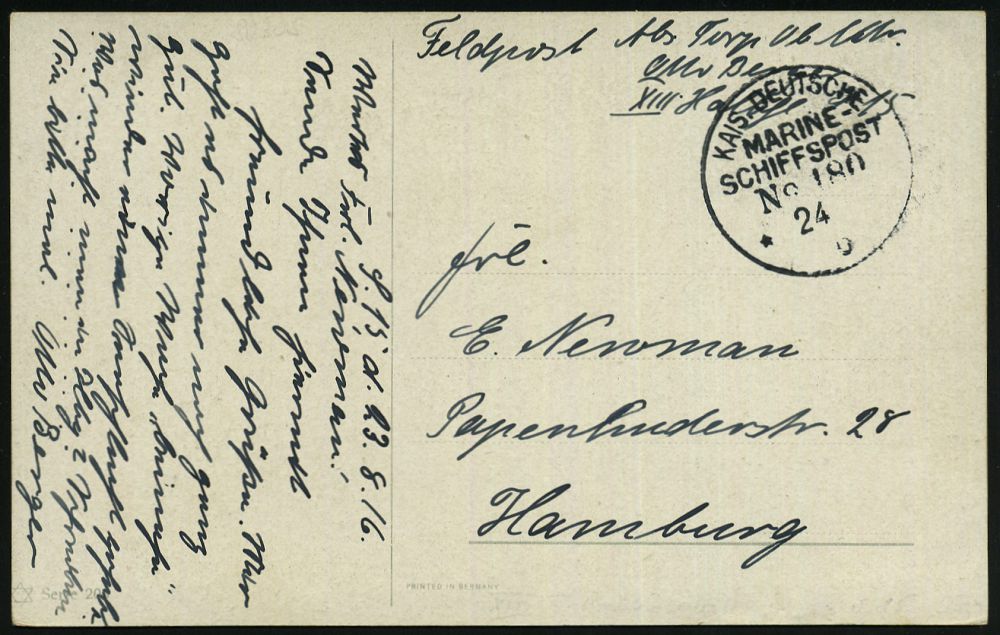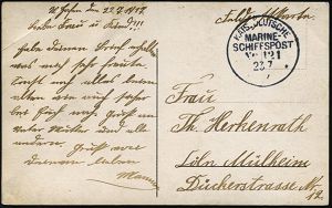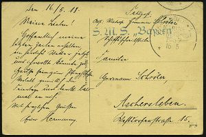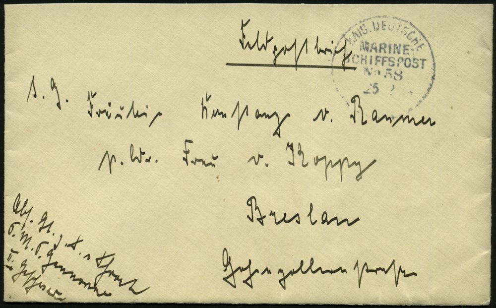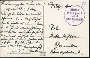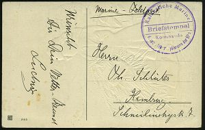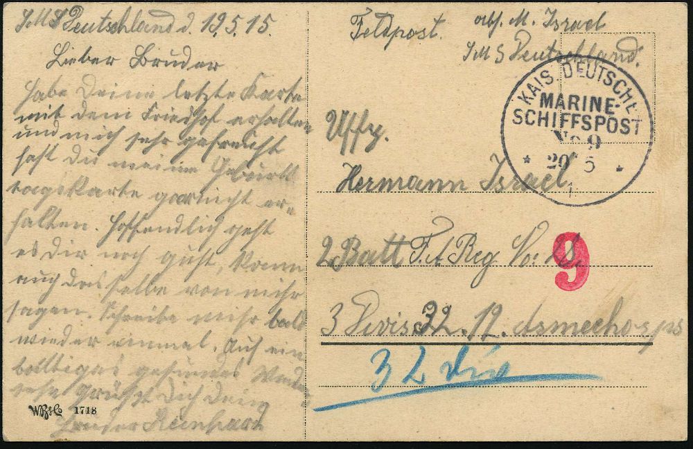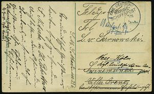 615 | 25 € | I.WELTKRIEG: DEUTSCHE MARINESCHIFFSPOST 1914 -18 : Marine-Schiffspost No. 9 1915 (20.5.) 1K-BPA: KAIS. DEUTSCHE/MARINE-/SCHIFFSPOST/No.9/** = S.M.S. "Deutschland" + hs. jüdischer Abs.: "M. J s r a e l , SMS Deutschland", patriot. Glückwunsch-Feldpost-Kt. (Pfingsten) an Inf.-Regt. No.28, interess. Kombination u. Konstellation! | ![]() ![]() | |