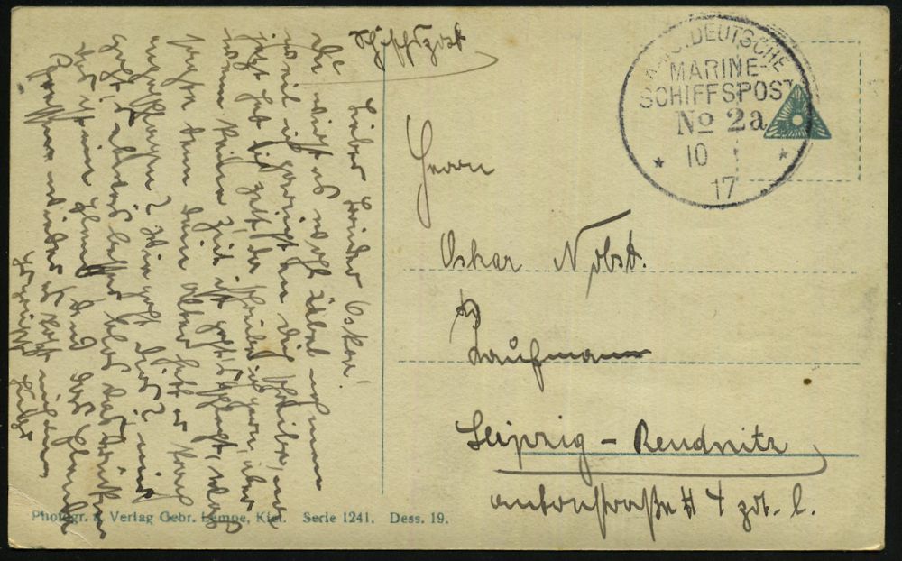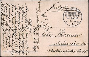 709 | 20 € | I.WELTKRIEG: DEUTSCHE MARINESCHIFFSPOST 1914 -18 : Marine-Schiffspost No. 141 a 1917 (17.3.) 1K-BPA: KAIS. DEUTSCHE/MARINE-/SCHIFFSPOST/Nr.141 a/** = S.M.S. "Schwaben", Linienschiff, "a" = seltener Ersatzstempel für den Verlust vom 21.12.1916 (ab Nov. 1915 Exerzier- u. Maschinen-Schulschiff!) + hs. Abs.: ".. S.M.S. Schwaben", klar gest. Feldpost-Künstler-Ak. (Zivilschiff auf hoher See) n. Münster | ![]() | |