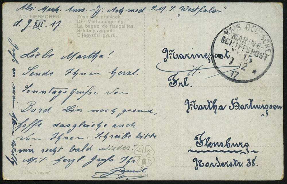 624 | 15 € | I.WELTKRIEG: DEUTSCHE MARINESCHIFFSPOST 1914 -18 : Marine-Schiffspost No. 15 1917 (9.12.) 1K-BPA: KAIS. DEUTSCHE/MARINE-/SCHIFFSPOST/No.15 = S.M.S. "Westfalen", Linienschiff + hs. Abs.: ".. S.M.S. ´Westfalen´", klar gest. Kitsch-Feldpost-Ak. n. Flensburg | ![]() | |