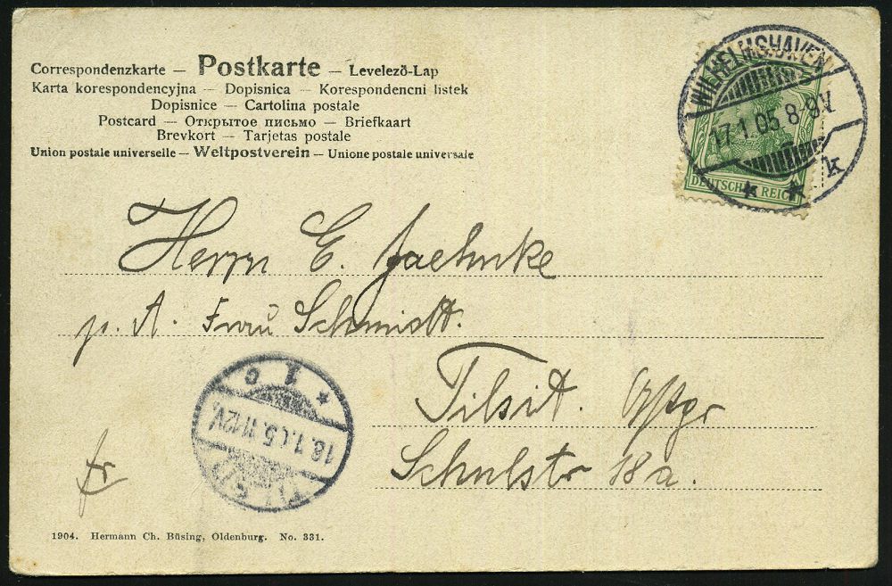 697 | 18 € | I.WELTKRIEG: DEUTSCHE MARINESCHIFFSPOST 1914 -18 : Marine-Schiffspost No. 135 1915 (16.12.) 1K-BPA: KAIS. DEUTSCHE/MARINE-/SCHIFFSPOST/No. 135 = S.M.S. "Kaiser Wilhelm II.", ab Mai 1915 Wohnschiff u. Büro Kommando der Hochsee-Flotte (Wilhelmshaven) klar gest. Color-Feldpost-Ak. (Jäger) n. Warnitz-Higg | ![]() ![]() | |