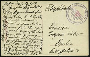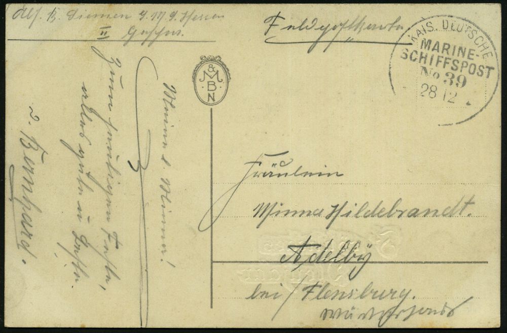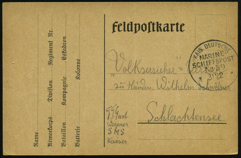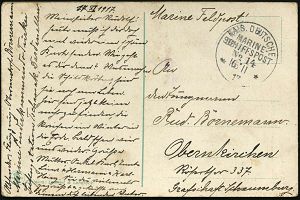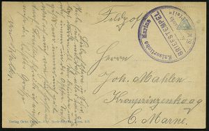 648 | 18 € | I.WELTKRIEG: DEUTSCHE MARINESCHIFFSPOST 1914 -18 : Marine-Schiffspost No. 59 1914 (31.12.) 1K-BPA: KAIS. DEUTSCHE/MARINE-/SCHIFFSPOST/No.59 = S.M.S. "Kaiser", Linienschiff + hs. Abs.: "..S.(ignal) Gast S.M.S. Kaiser", klar gest. Feldpost-Kt. n. Berlin = sehr frühe verwendung Bordpostamt (1.Monat) | ![]() | |