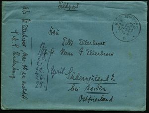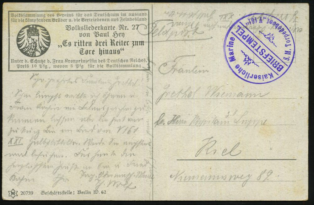 638 | 20 € | I.WELTKRIEG: DEUTSCHE MARINESCHIFFSPOST 1914 -18 : Marine-Schiffspost No. 40 1916 viol. 1K-Brücken-Briefstempel: Kaiserliche Marine/S.M. Torpedoboot "V 161" = 21. Torpedoboot-Halbflottille (= MSP No.40) + hs. Abs.: ".. XXI. Halbflottille" , glasklar gest., patriot. Feldpost-Spenden-Künstler-Ak.: Es ritten drei Reiter.. (Volkslied-Kt. Nr. 27 von Paul Hey) n. Kiel, selten! | ![]() ![]() | |