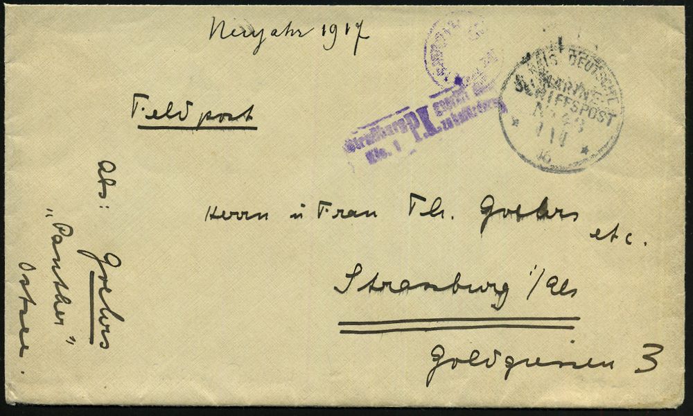 639 | 18 € | I.WELTKRIEG: DEUTSCHE MARINESCHIFFSPOST 1914 -18 : Marine-Schiffspost No. 43 1916 (1.1. = 1917) 1K-BPA: KAIS. DEUTSCHE/MARINE-/SCHIFFSPOST/No.48 = S.M.S. "Panther", Kanonenboot + hs. Abs.: ".. "Panther" Ostsee" + viol. Zensur-Ra.2: Straßburg/Els. I/P.K./geprüft und/zu befördern + weiterer 1K (undeutl.) Feldpost-Zensur-Bf. n. Straßburg/Els. | ![]() | |