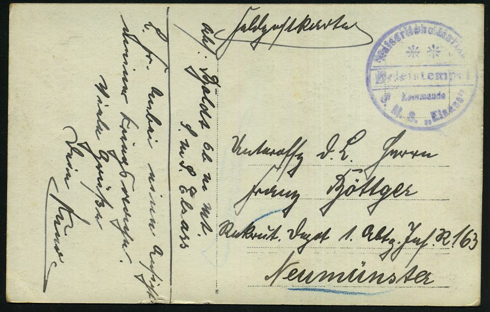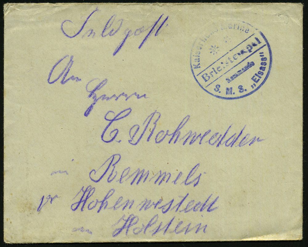 712 | 20 € | I.WELTKRIEG: DEUTSCHE MARINESCHIFFSPOST 1914 -18 : Marine-Schiffspost No. 162 1914 viol. 1K-Brücken-Briefstempel: Kaiserliche Marine/Kommando/S.M.S. "Elsass" (= MSP No. 162) Linienschiff, IV. Geschwader Hochsee-Streitkräfte (Postausrüstung nur 1.4.1915 - Juli 1916) hs. Abs.: ".. S.M.S. Elsass", individuelle Feldpost-Foto-Ak.: Gruppenfoto eines Teils der Mannschaft mit Offizieren n. Neumünster | ![]() ![]() | |