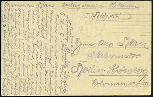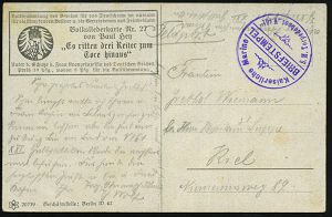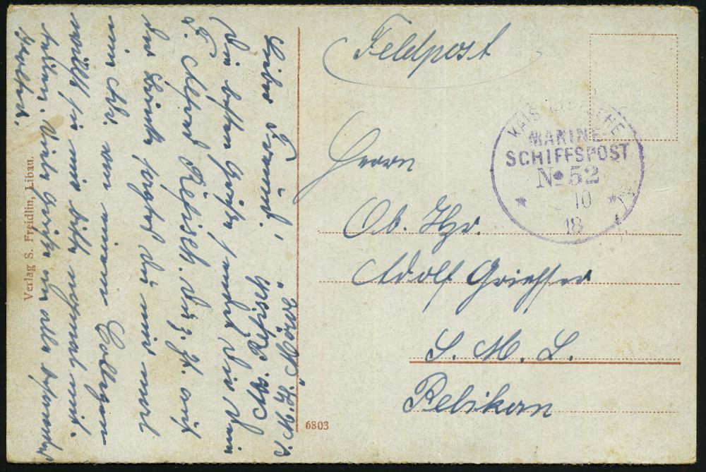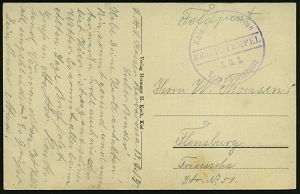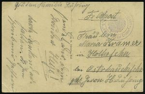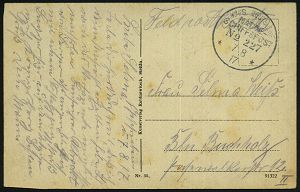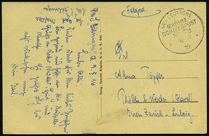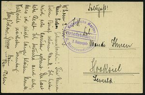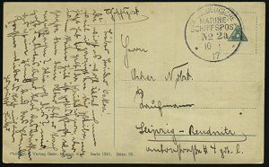 643 | 120 € | I.WELTKRIEG: DEUTSCHE MARINESCHIFFSPOST 1914 -18 : Marine-Schiffspost No. 52 1918 (Okt.) v i o l e t t e r 1K-BPA: KAIS. DEUTSCHE/MARINE-/SCHIFFSPOST/No.52/** = S.M.S. "Möwe", Hilfskreuzer (des Dampfer "Pugo" der Afrikan. Fruchkompagnie, Hambg.) + hs. Abs.: "S.M.S. Möwe", berühmt für 2 glückliche Atlantik-Feind-Fahrten!, sehr seltene Feldpost-Ak. (Libau) lt. Crüsemann Stempel nur bis 24. Juni 1918 belegt und kaum verwendet! | ![]() | |