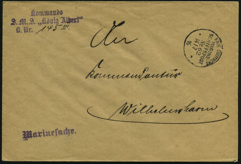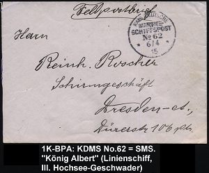 652 | 16 € | I.WELTKRIEG: DEUTSCHE MARINESCHIFFSPOST 1914 -18 : Marine-Schiffspost No. 62 1916 (14.7.) 1K-BPA: KAIS. DEUTSCHE/MARINE-/SCHIFFSPOST/No.62/** = S.M.S. "König Albert", Linienschiff + viol. 3L: Kommando/S.M.S. "König Albert".. + rs. viol. 1K-Steg-HdN: Kaiserliche Marine/ S.M.S. König Albert, klar gest. Marine-Dienst-Bf. n. Wilhelmshaven | ![]() ![]() | |