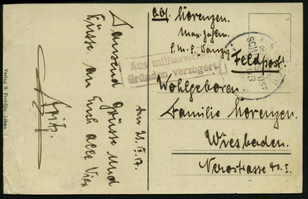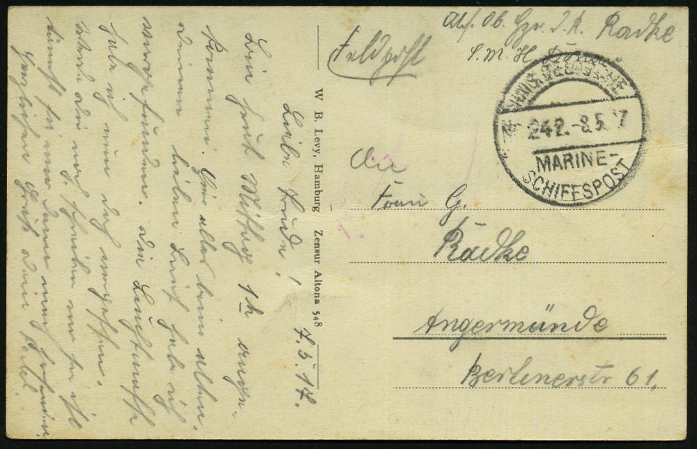 655 | 25 € | I.WELTKRIEG: DEUTSCHE MARINESCHIFFSPOST 1914 -18 : Marine-Schiffspost No. 65 1917 (25.9.) 1K-BPA: KAIS: DEUTSCHE/MARINE-/SCHIFFSPOST/No.65 = S.M.S. "Danzig", Kleiner Kreuzer, ab Juni 1917 Zielschiff für kleine Kreuzer, Torpedo- und U-Bote ! , hs. Abs.: "..S.M.S. Danzig" + viol. Zensur-Ra.: Aus militärischen/ Gründen verzögert, s/w.-Feldpost-Feldpost-Ak.: Libau (Mole) n. Wiesbaden, seltene Verwendungszeit! | ![]() | |